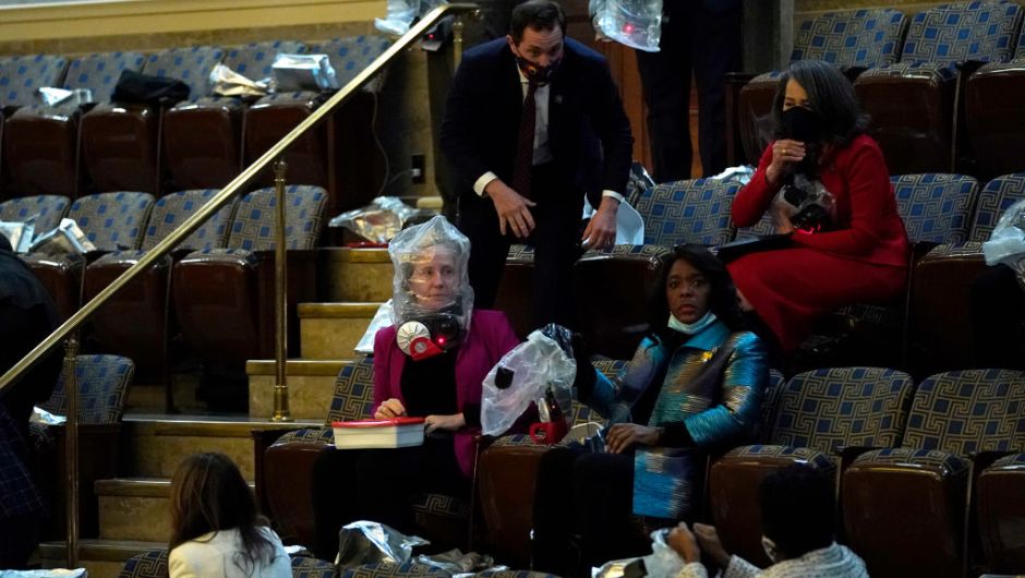 WASHINGTON, DC – JANUARY 06: People wear plastic bags s protesters attempt to enter the House Chamber during a joint session of Congress on January 06, 2021 in Washington, DC. Congress held a joint session today to ratify President-elect Joe Biden’s 306-232 Electoral College win over President Donald Trump. A group of Republican senators said they would reject the Electoral College votes of several states unless Congress appointed a commission to audit the election results. (Photo by Drew Angerer/Getty Images)