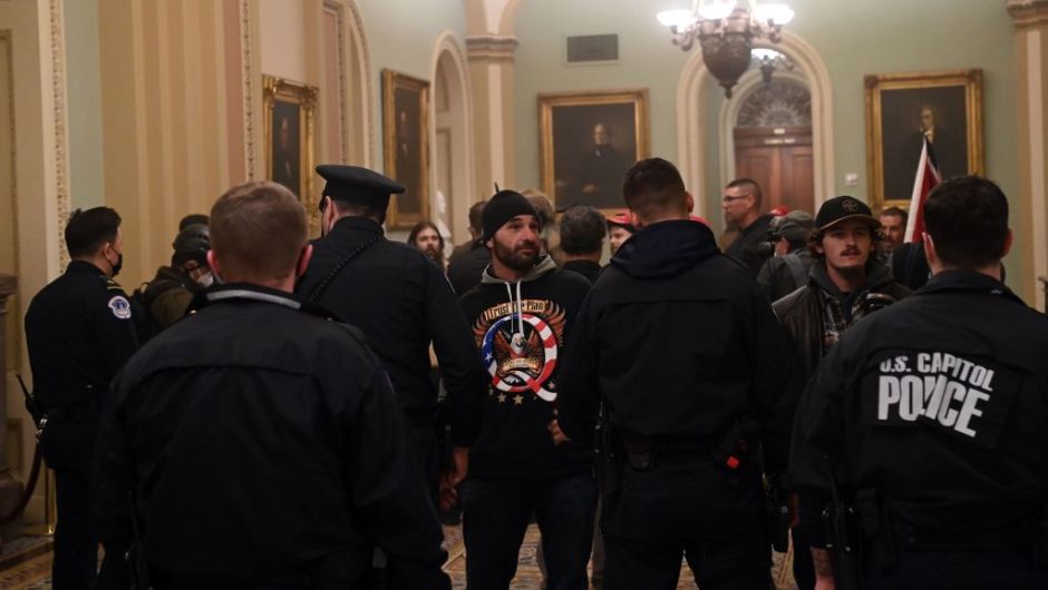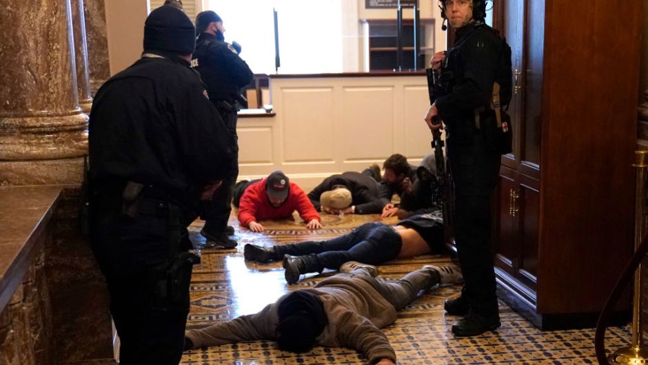 WASHINGTON, DC – JANUARY 06: U.S. Capitol Police stand detain protesters outside of the House Chamber during a joint session of Congress on January 06, 2021 in Washington, DC. Congress held a joint session today to ratify President-elect Joe Biden’s 306-232 Electoral College win over President Donald Trump. A group of Republican senators said they would reject the Electoral College votes of several states unless Congress appointed a commission to audit the election results. (Photo by Drew Angerer/Getty Images)