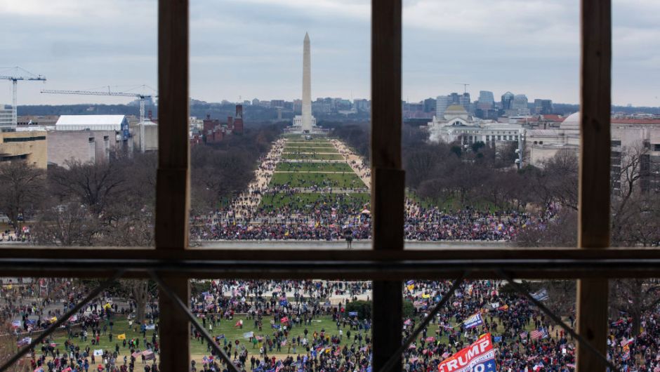 WASHINGTON, DC – JANUARY 06: A crowd of Trump supporters gather outside as seen from inside the U.S. Capitol on January 6, 2021 in Washington, DC. Congress will hold a joint session today to ratify President-elect Joe Biden’s 306-232 Electoral College win over President Donald Trump. The joint session was disrupted as the Trump supporters breached the Capitol building. (Photo by Cheriss May/Getty Images)