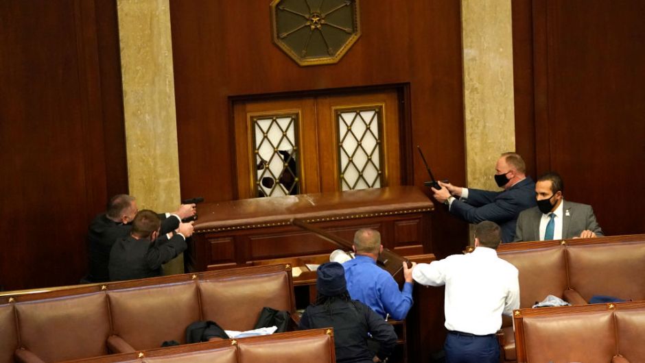 WASHINGTON, DC – JANUARY 06: Law enforcement officers point their guns at a door that was vandalized in the House Chamber during a joint session of Congress on January 06, 2021 in Washington, DC. Congress held a joint session today to ratify President-elect Joe Biden’s 306-232 Electoral College win over President Donald Trump. A group of Republican senators said they would reject the Electoral College votes of several states unless Congress appointed a commission to audit the election results. (Photo by Drew Angerer/Getty Images)