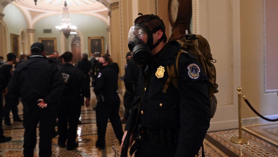 A US Capitol police officer wears a gas mask as supporters of US President Donald Trump enter the Capitol on January 6, 2021, in Washington, DC. – Demonstrators breeched security and entered the Capitol as Congress debated the a 2020 presidential election Electoral Vote Certification. (Photo by Saul LOEB / AFP) (Photo by SAUL LOEB/AFP via Getty Images)
