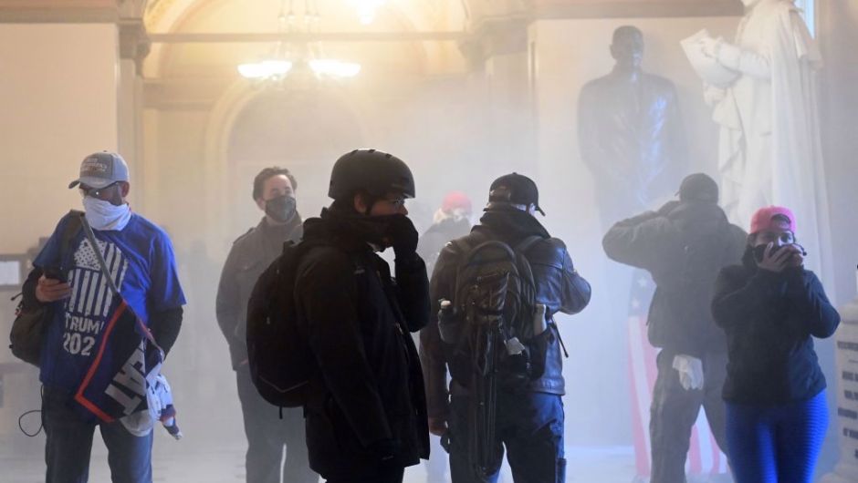 Supporters of US President Donald Trump enter the US Capitol as tear gas fills the corridor on January 6, 2021, in Washington, DC. – Demonstrators breeched security and entered the Capitol as Congress debated the a 2020 presidential election Electoral Vote Certification. (Photo by Saul LOEB / AFP) (Photo by SAUL LOEB/AFP via Getty Images)