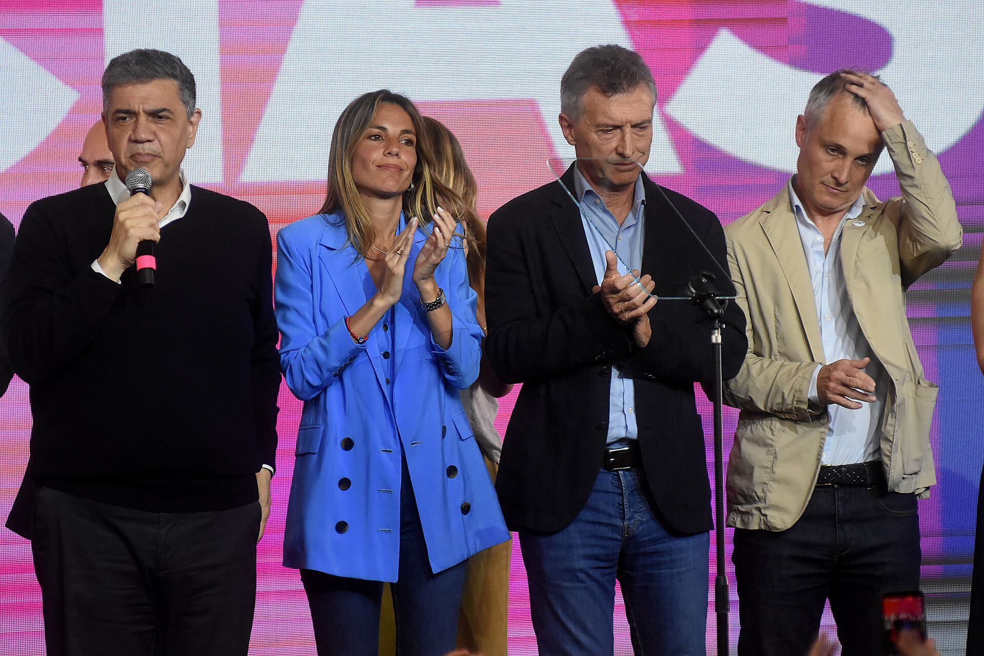 Jorge Macri fue acompañado en el escenario por la plana mayor de JxC. Desde Mauricio Macri, Larreta, Vidal y Maximiliano Ferraro. Aunque ninguno emitió sonido. Improvisaron sonrisas y gestos de algarabía alzando las manos. La militancia aplaudía y trataba de inyectar épica. Sin embargo, el discurso fue breve, centrado en CABA y se limitó a decir que “los resultados nacionales no son los que esperábamos”. A las 22, la tarima volvió a quedar vacía ante la expectativa de un posible discurso de Bullrich que intente explicar los porqués del resultado menos esperado para su espacio político.